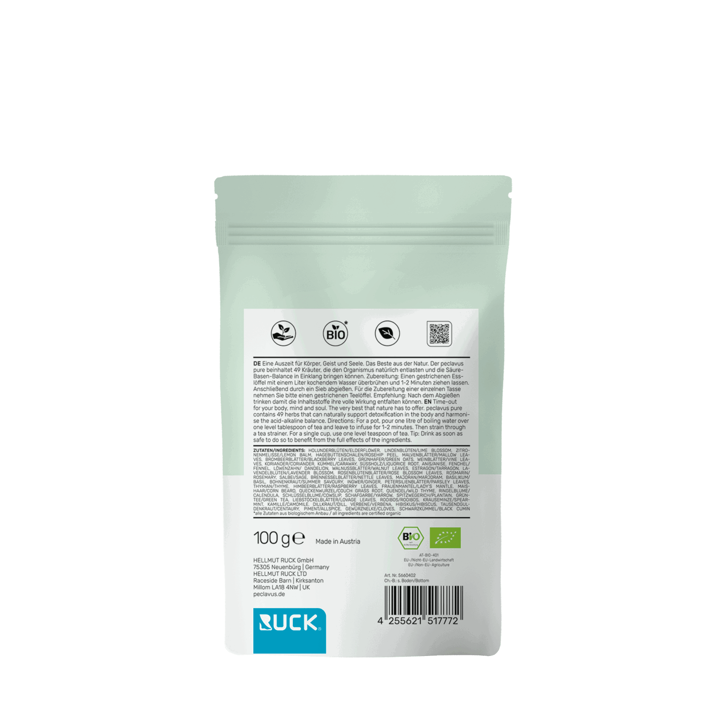 Die Kräutermischung des peclavus pure BIO Basentee Kräuterharmonie wurde speziell entwickelt, um eine wohltuende Auszeit zu ermöglichen. Die sorgfältig ausgewählten Zutaten stammen aus kontrolliert biologischem Anbau (BIO*) und sind zu 100% natürlichen Ursprungs. Ob heiß oder kalt genossen, dieser Tee ist ein Genuss für alle Sinne und bietet eine geschmackvolle Ergänzung zu einer ausgewogenen Ernährung.