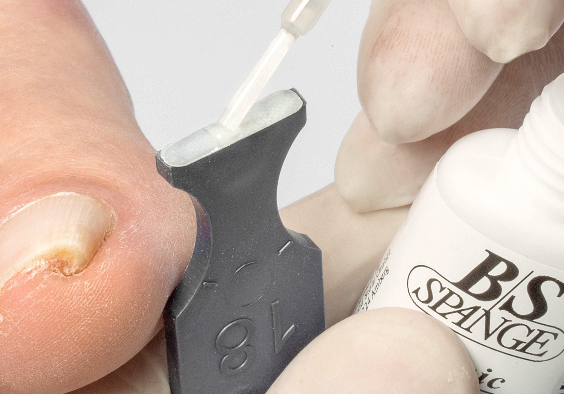 Die B/S-Spange ist wasserresistent und optisch unauffällig (Nagel und Spange können farbig lackiert werden).