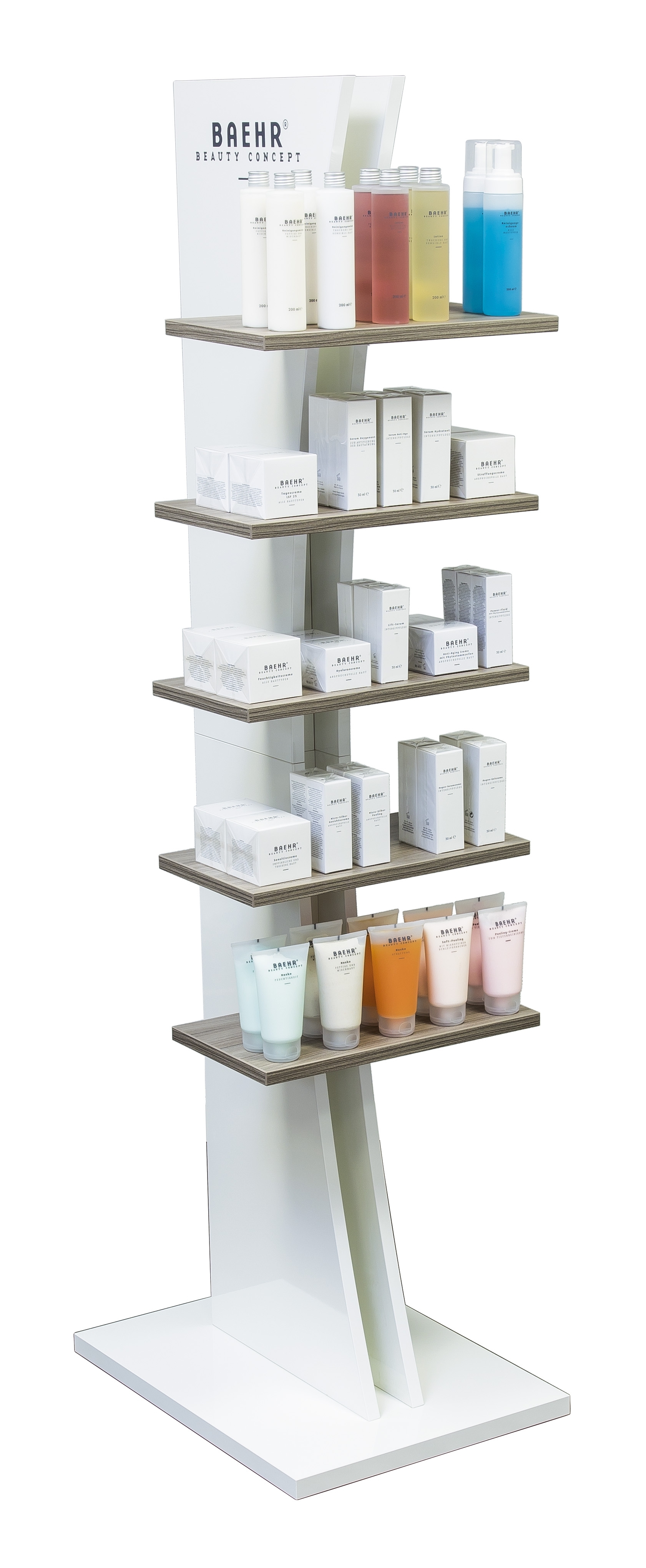 Produktinformationen "BAEHR BEAUTY CONCEPT - Bodendisplay mit Holzdekor-Regalböden"