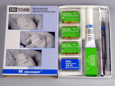 Das ERKODENT ERKI-Set ist ein Nagelkorrektur-System mit unterschiedlich einstellbaren Zugkräften durch drei verschiedene Gummiringe. Es enthält 100 ERKIS, 100 Überzugsschläuche, je 100 Gummiringe in 3 verschiedenen Größen, 1 Greifpinzette, 1 Durchziehnadel und 1 Klebe-Gel.