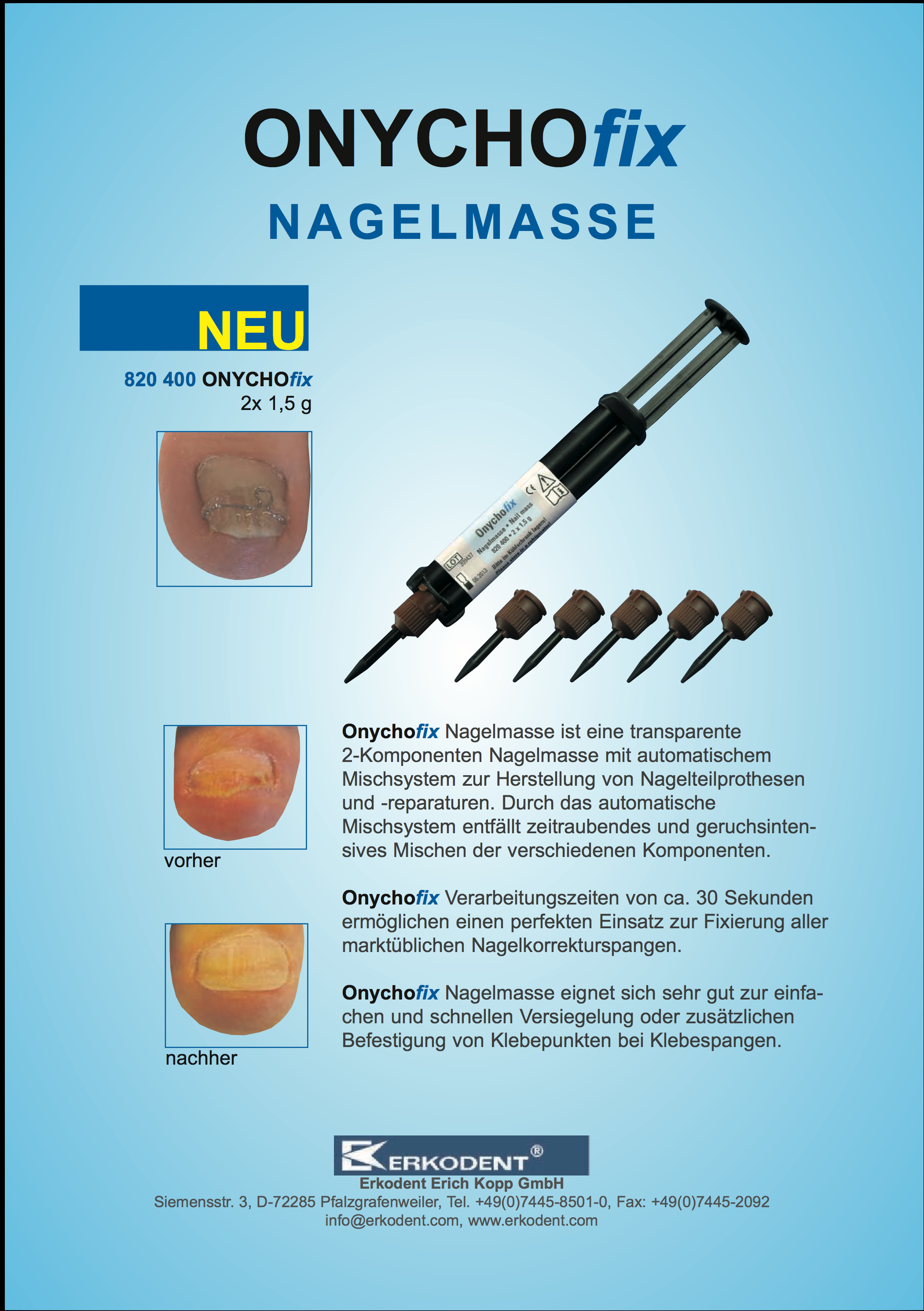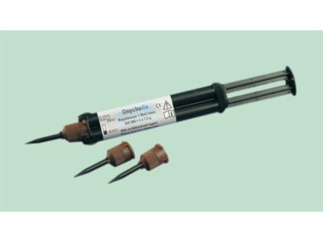 Onychofix ist eine transparente2-Komponenten Nagelmasse mit automatischem Mischsystem zur Herstellung von Nagelteilprothesen und -reparaturen. Durch das automatische Mischsystem entfällt zeitraubendes und geruchsintensives Mischen der verschiedenen Komponenten.