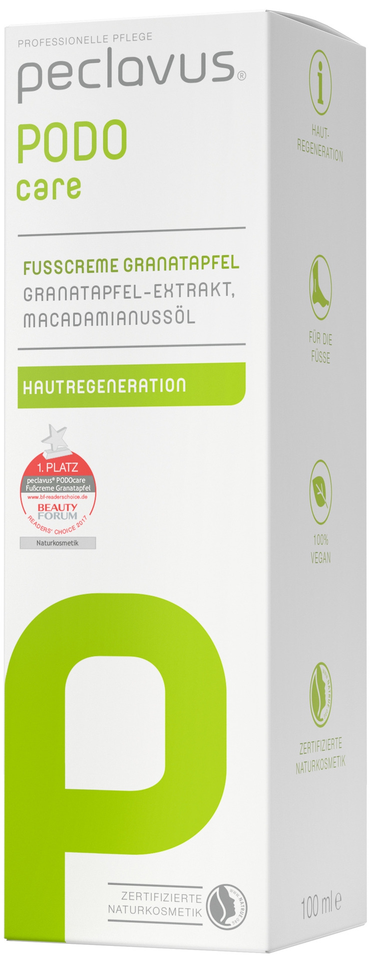 Die peclavus® PODOcare Fußcreme Granatapfel regeneriert die Haut und macht die Füße fruchtig-frisch. Natürliche Antioxidantien aus zellerneuerndem Bio-Granatapfel-Extrakt und wertvollem Bio-Wildrosenöl sorgen für eine optimale Pflege. Das reich enthaltene Öl der Macadamianuss schützt zusätzlich die Hautbarriere. Die Fußcreme ist für alle Hauttypen geeignet, einschließlich trockener Haut. Sie ist NATRUE-zertifizierte Naturkosmetik und vegan.