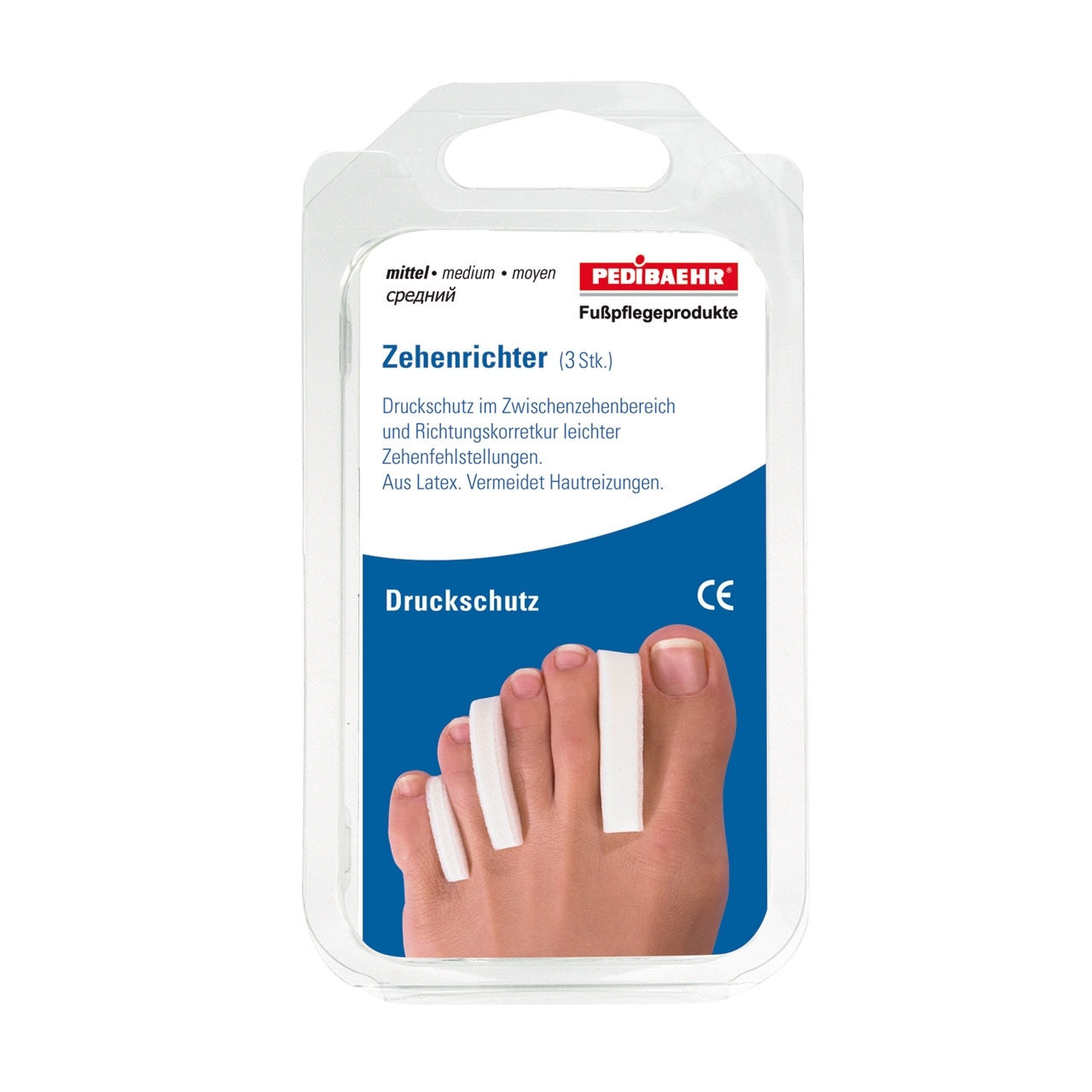 Die Pedibaehr Zehenrichter mittel 3 Stück sind ein hochwertiges Medizinprodukt der Klasse I, das speziell entwickelt wurde, um den Bedürfnissen von Personen gerecht zu werden, die unter Druckstellen von verlagerten, schiefstehenden Zehen leiden. Hergestellt aus weichem Latex, bieten diese Zehenrichter eine wirksame Druckentlastung und Korrektur im Zwischenzehenbereich, wodurch Schmerzen und Unbehagen gelindert werden können.